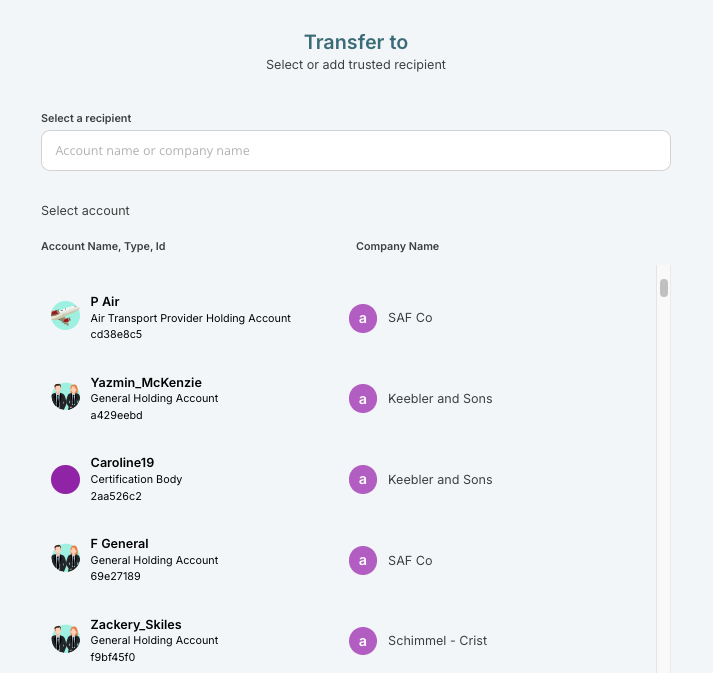 When you initiate a transfer on the SAFc Registry, you can choose the receiving account from a list of all active accounts on the registry. Each account's name, type, ID, and owning company is displayed on the "Transfer to" screen: